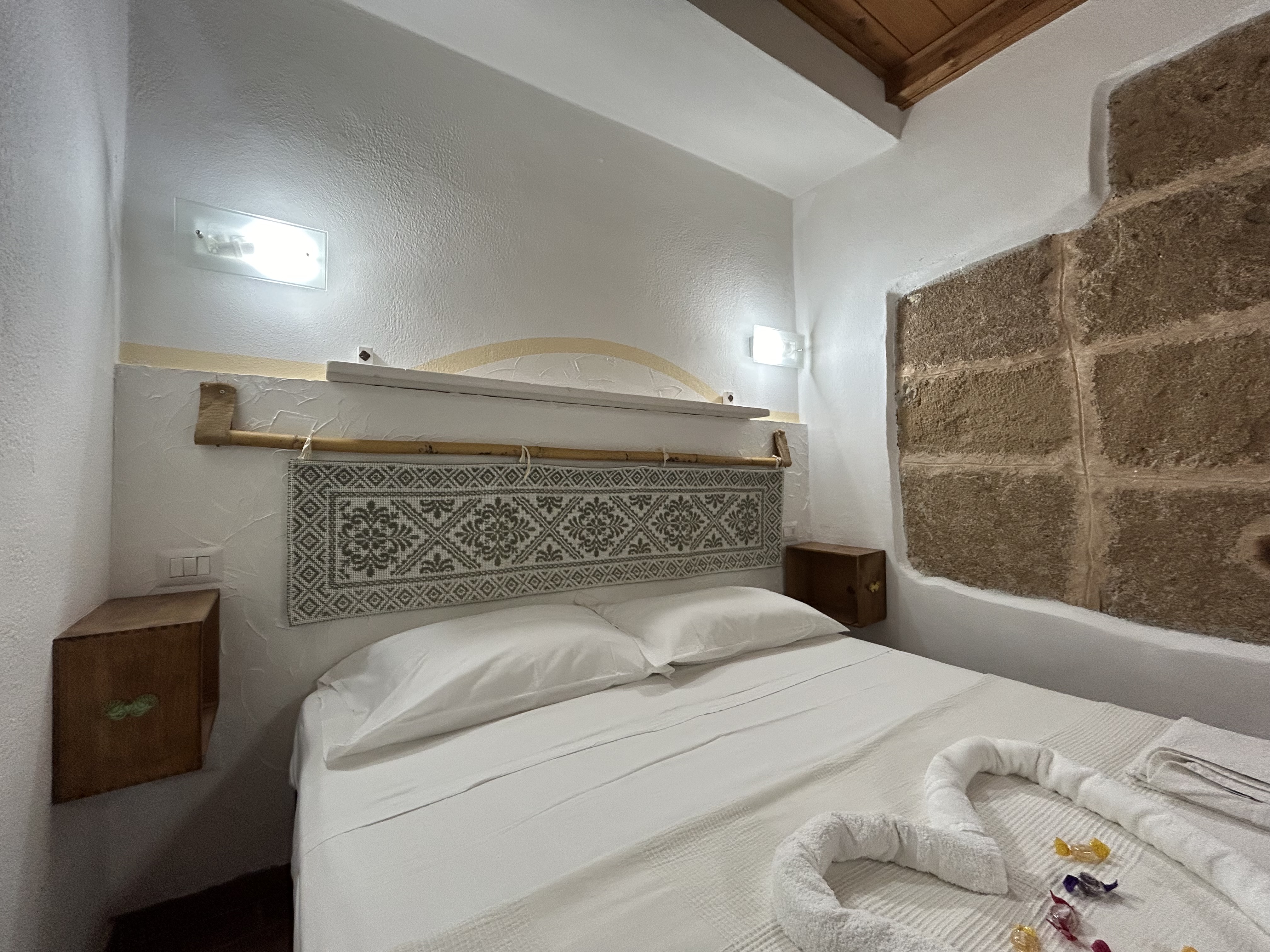 AIGUA 4 è una camera che celebra l'armonia tra sostenibilità e comfort. Con soffitto in legno, pareti in pietra locale e dettagli eco-friendly, l'ambiente è accogliente e luminoso. Il letto matrimoniale, arricchito da una testiera in tessuto naturale, crea un’atmosfera rilassante. L'illuminazione LED a basso consumo e la TV a schermo piatto completano lo spazio, ideale per chi cerca una permanenza eco-sostenibile senza rinunciare alla modernità.